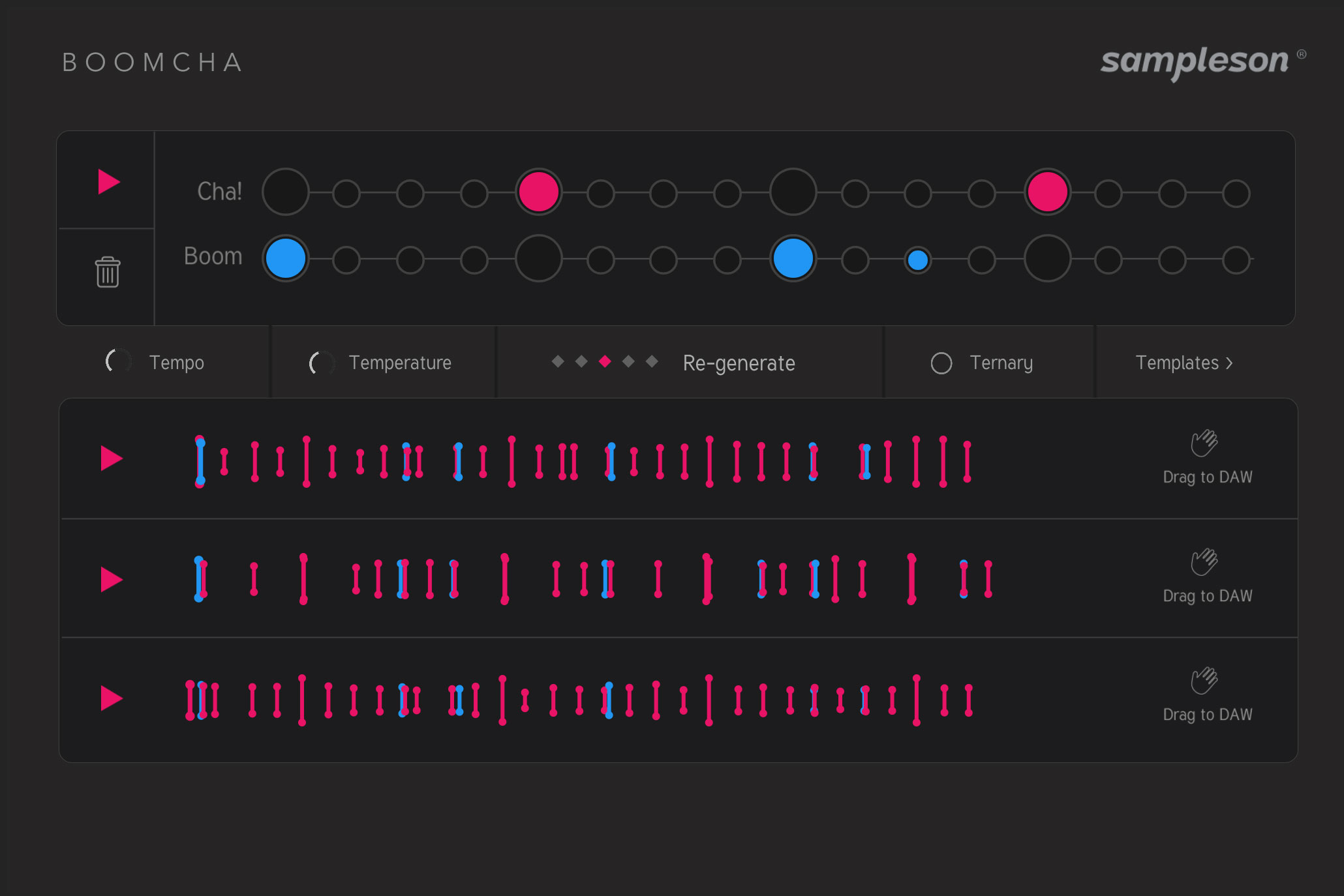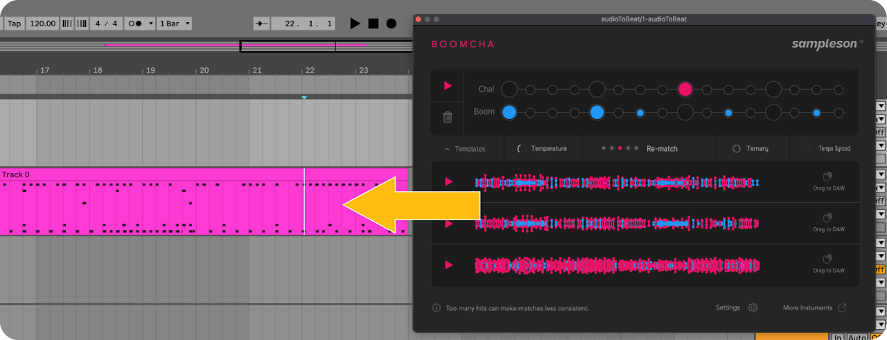 Boomcha allows you to drag and drop the generated MIDI grooves directly into your DAW. Simply click and hold on the groove you want, drag it to your desired track, and drop it in place.