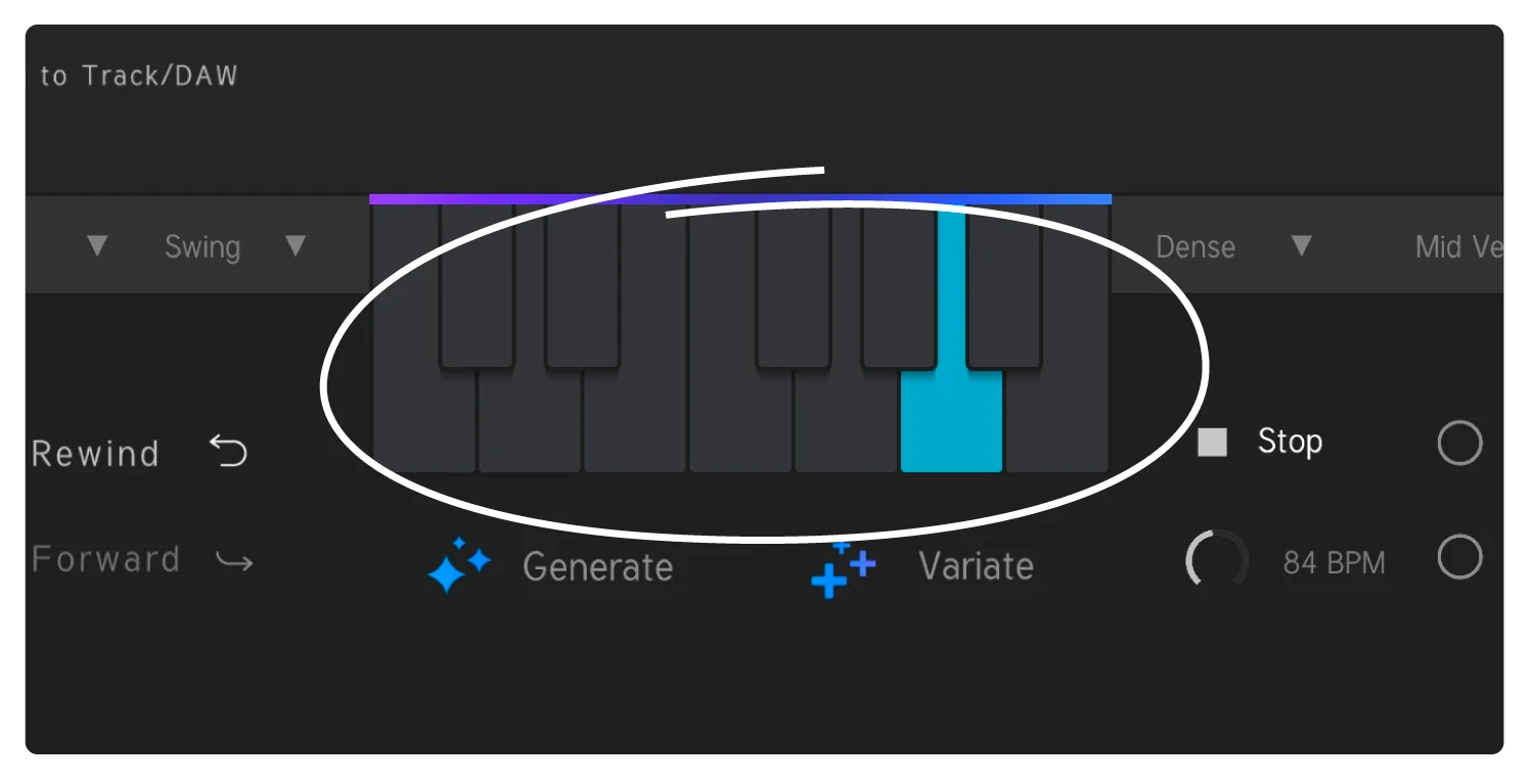 Click on Generate to get a new generation based on the parameters you picked. Once you find something you like, you can click on Variate to create variations for the same rhythm structure (good for consecutive bars to avoid repetition).